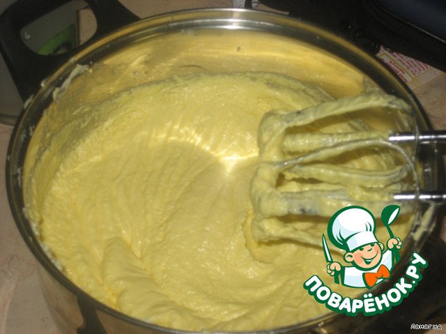 К маргарину с яйцами добавить муку,крахмал и разрыхлитель.