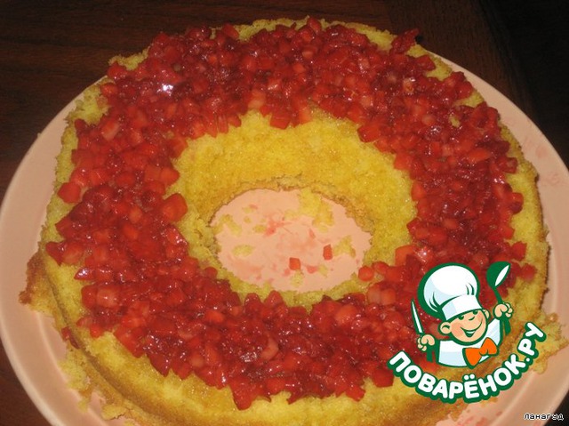 Клубнику мелко порезать кубиками,несколько ягод оставить для украшения(5 шт).
