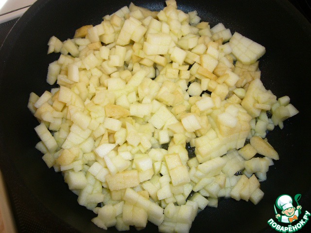 Растопить на сковороде сливочное масло и обжарить яблочные кубики минуты две.