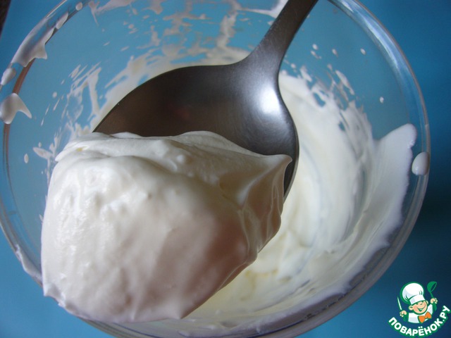 Взбить сливки с ложкой сахарной пудры в крепкую пену.