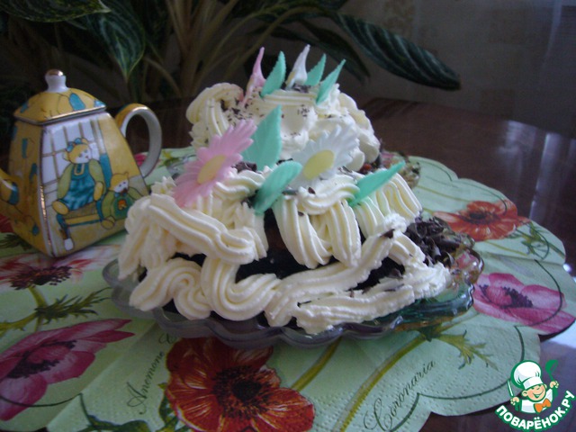Я чуть-чуть посыпала шоколадной стружкой, украсила вафельными маргаритками и листочками.