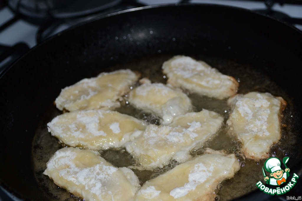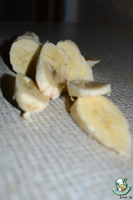 Каждый ломтик банана сначала обвалять в муке, затем в белке и опять в муке.