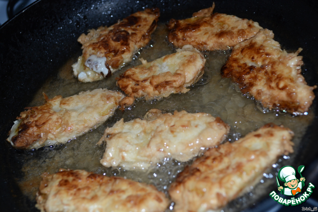 Бананы обвалять в муке, затем в белке и опять в муке. Жарить на раскаленной сковороде до румяной корочки.