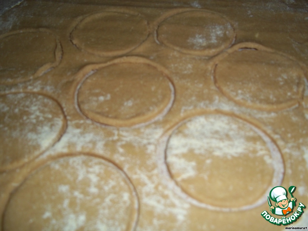 Так расскатываем все тесто и делаем кружочки и отправляем нв форму с пергаментной бумагой. У меня получились 2 огромных формы. В духовку на 15-20 минут, 220-240 градусов.