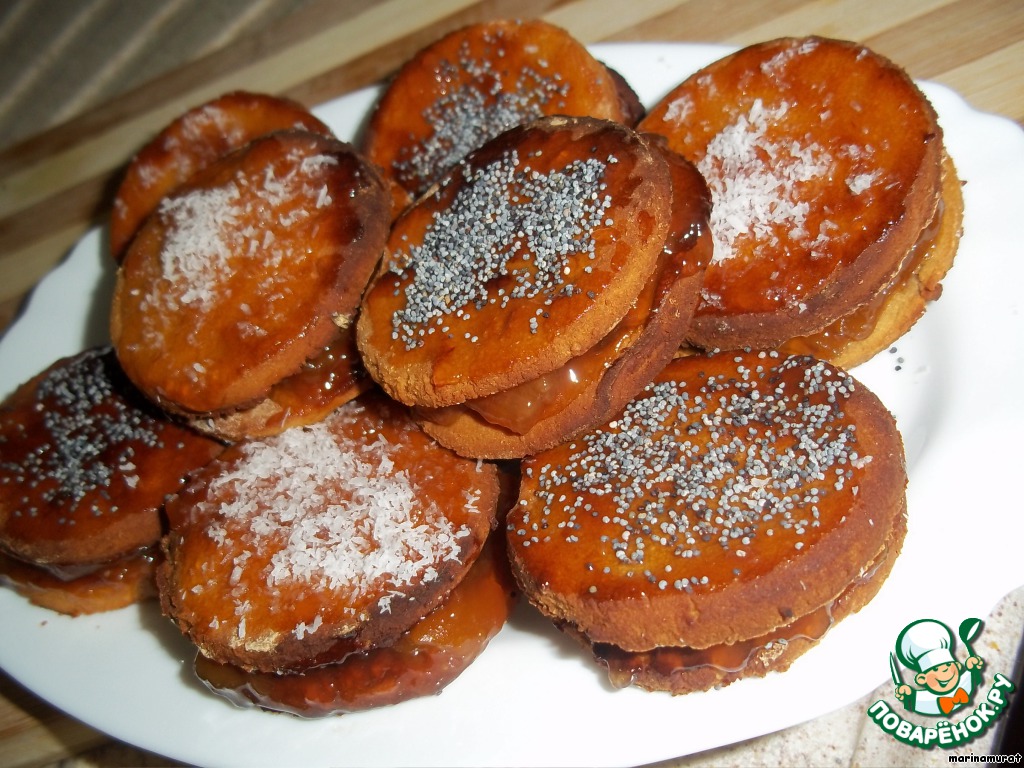 Готовое печенье остужем, смазываем кружочек джемом (у меня персиковый), кладем сверху второй кружочек, тоже слегка смазываем джемом и посыпаем маком или кокосовой стружкой. Готово.