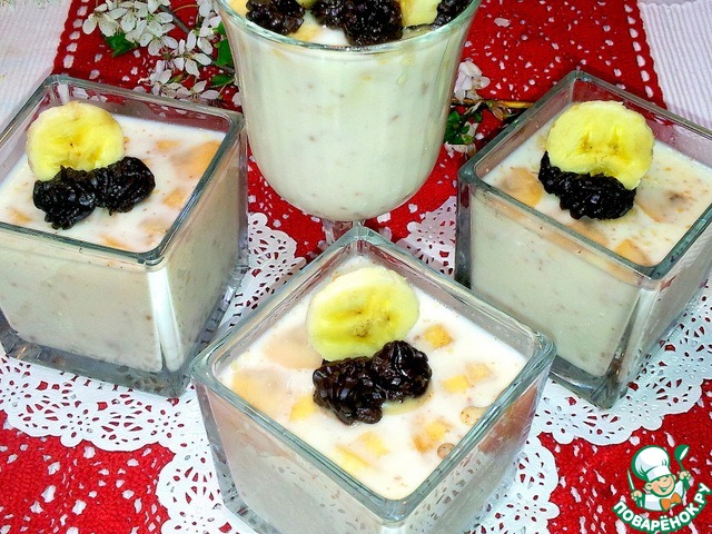 Желатин залила тёплой водой и полностью растворила подогревая на плите, но не доведя до кипения. Процедила и немного остудила. Налила йогурт в ёмкость с желатином. Мелко нарезала банан и переложила в жидкость. Все 4 ёмкости по 200 мл. В низкие добавила коньяк по столовой ложке. Бокал на ножке для маленькой девочки.