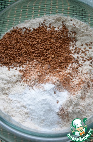 Муку смешать с разрыхлителем, добавить щепотку соли, корицу, кофе перемешать
