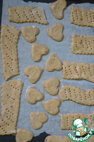 Раскатать тесто в пласт толщиной 1 см. Вырезать из него печенье разной формы (сердечки, прямоугольники). Разогреть духовку до 200°С. Противень