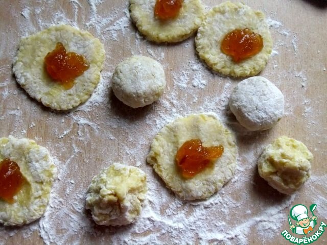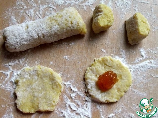 Размешать и из полученного теста оформить небольшие лепешки, в середину каждой из них положить по ложечке повидла.