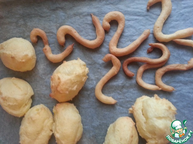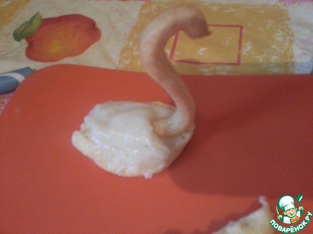 Застелить на противень пергаментную бумагу и с помощью столовой ложки выгладываем тесто. Шею наших лебедей я сделала с кондитерским мешком и выложила в форме латинской буквы S. Выпекаем в разогретой 160*С духовке 30-35минут.