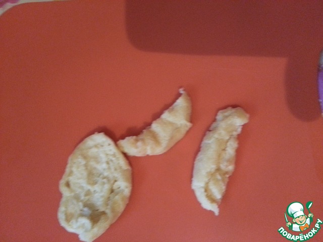 Теперь приступаем к работе наших лебедей. Берём профитроль и делим пополам, и одну часть ещё разрезать посередине. Это будут крылья.