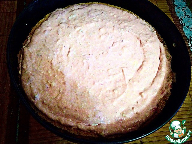 Бисквит уже остыл, помещаем его обратно в разъемную форму, вверх дном и наносим начинку, аккуратно не доходя до краем бисквита.