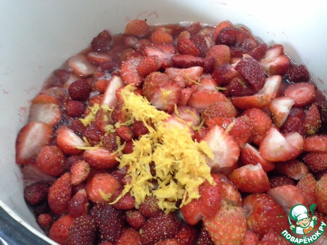 Клубнику режем на четвертинки или половинки, кладем в сотейник, добавляем 200 мл воды и свежую цедру лимона. Ставим на огонь, доводим до кипения и варим 5 минут. Остужаем до комнатной температуры.
