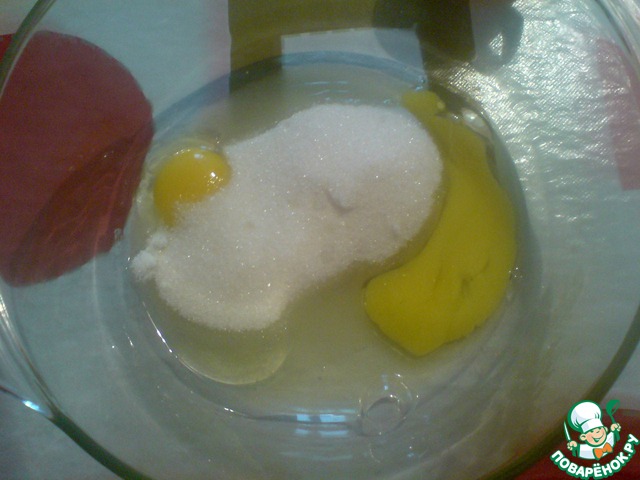 В миску разбить 2 яйца и высыпать сахар. Хорошо взбить миксером.