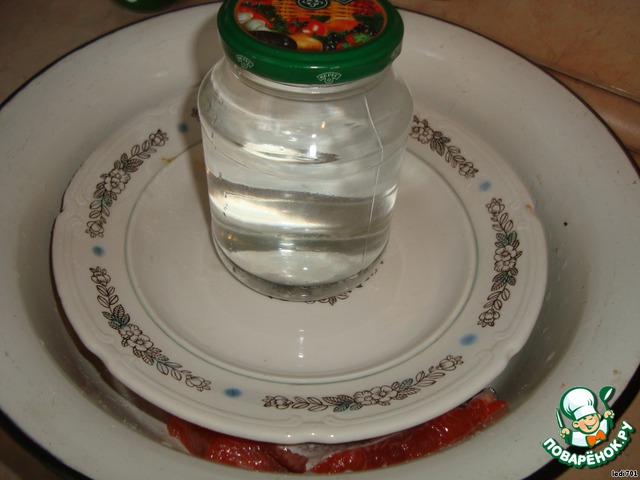 Накрываем тарелкой и ставим небольшой пресс. Оставляем при комнатной температуре часа на 4-5. Затем убираем пресс и убираем рыбу в холодильник на 8 часов. Обычно я убираю на ночь.