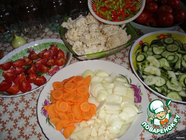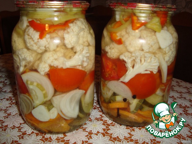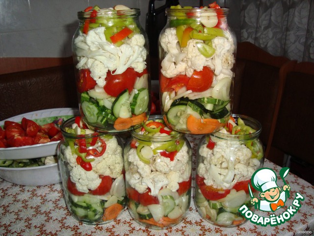 В подготовленные банки положить 2 бутона гвоздики,5 горошин перца.Овощи слоями:Морковь,огурцы,лук,помидоры,капусту,перец,чеснок.