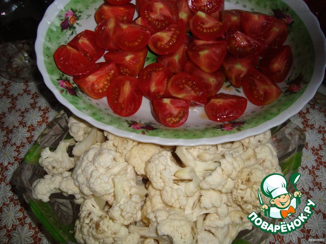 Помидоры дольками,цветную капусту разобрать на соцветия.