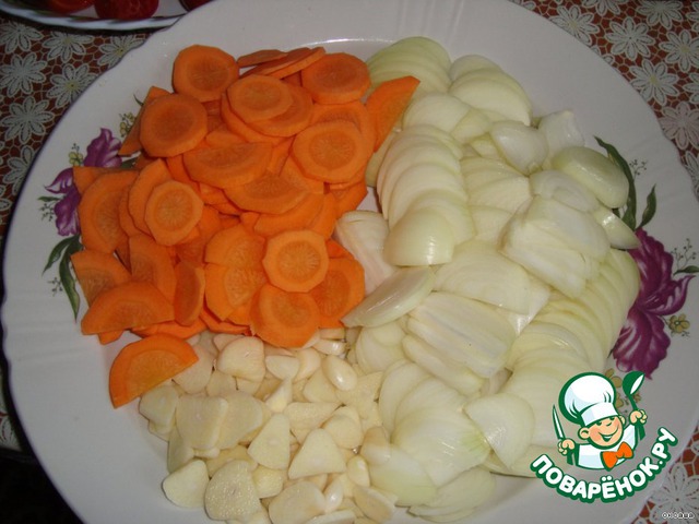 Лук-полукольцами,морковь-колечками,чеснок-пластинками.