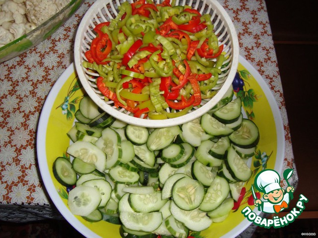Огурцы крупные-полукольцами,средние-колечками.Перец-полосками.
