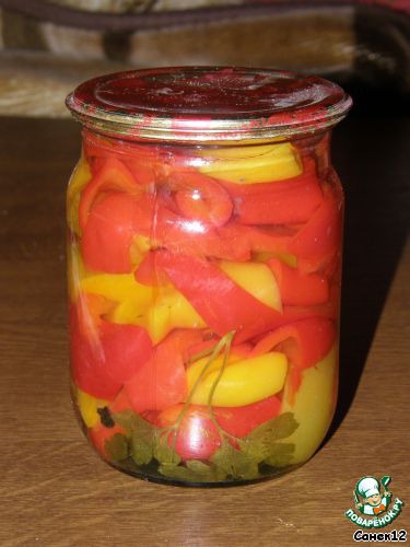 Перец очистить от семян и нарезать полосками на 8 частей. Залить водой с сахаром, солью и уксусом и кипятить 10-15 минут. На дно пол-литровой банки положить зубчик чеснока, веточку петрушки, 5-8 горошин чёрного перца. Разложить перец с маринадом и закатать крышками. Мировой закусон!!!