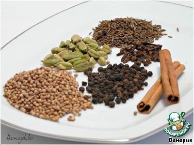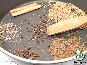Прежде чем смешивать пряности,каждую из них прожарить на сухой чугунной сковороде (я прожаривала всё на одной сковороде, но в разных кучках). Это нужно для того, чтобы характерный аромат каждой пряности усилился. Прожаривать специи надо до тех пор, пока они немного не потемнеют.