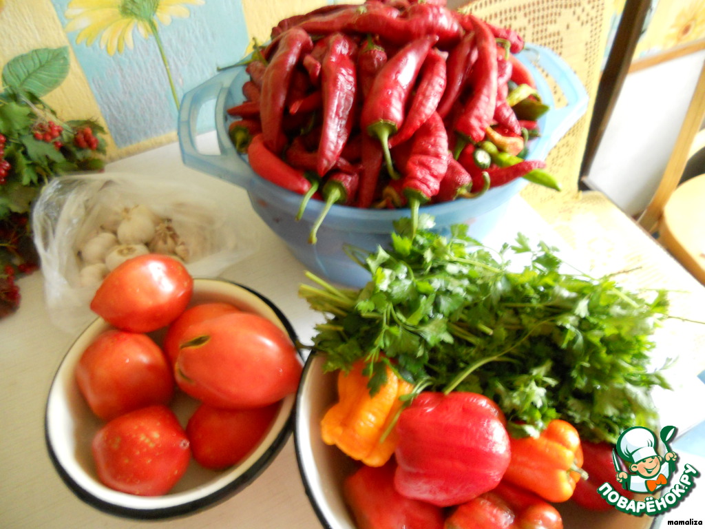 | Предлагаю очередной рецепт аджики, пригодной для длительного хранения. Моя аджика очень острая и ароматная. Есть ее ложкой решится далеко не каждый. Но я ее очень активно использую для приготовления соусов, маринадов, в качестве добавки практически в любые супы, мясные и овощные блюда. Она хранится в холодильнике целый год, не теряя своих свойств. Еe состав подсмотрела на баночке с аджикой, изготавливаемой на одном из местных заводов. Она мне очень понравилась. И, конечно, я ее адаптировала на свой вкус. |