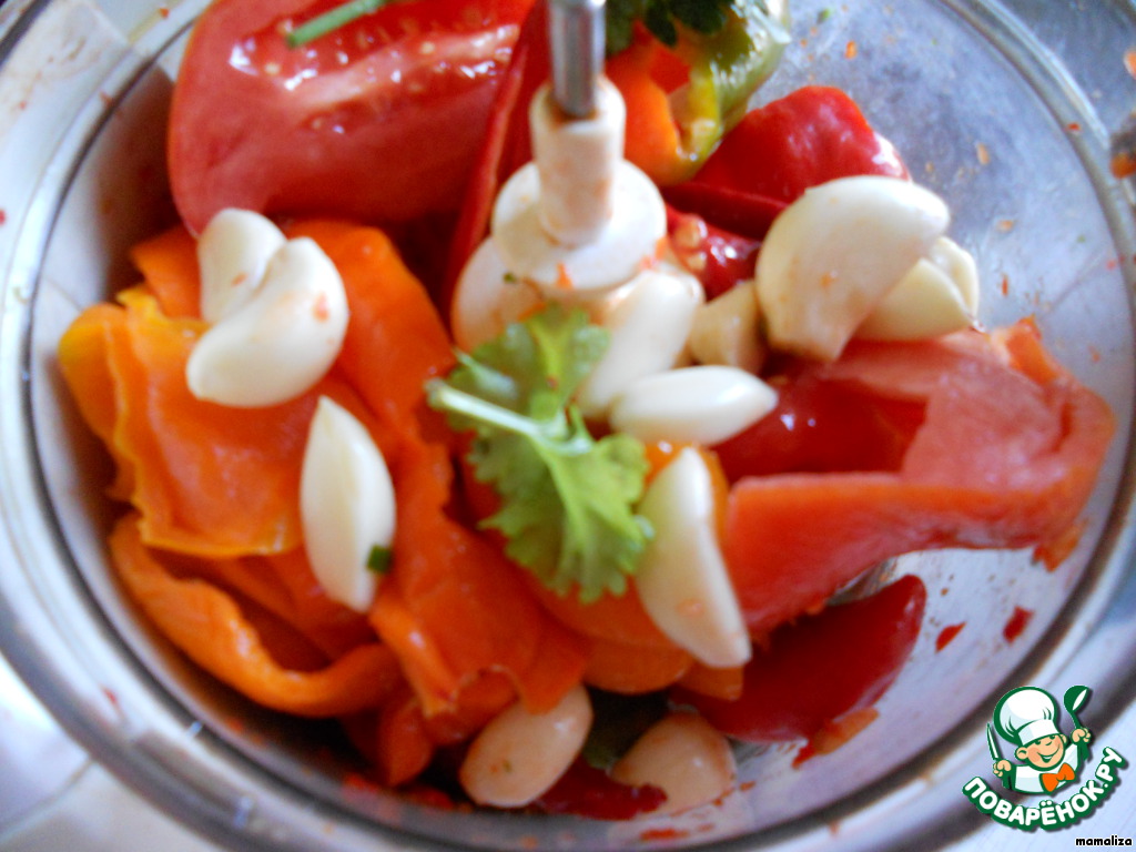 Все перемолоть в мясорубке или в блендере. В чашу блендера советую класть понемногу всех ингредиентов сразу, тогда получается необходимая нам структура аджики.