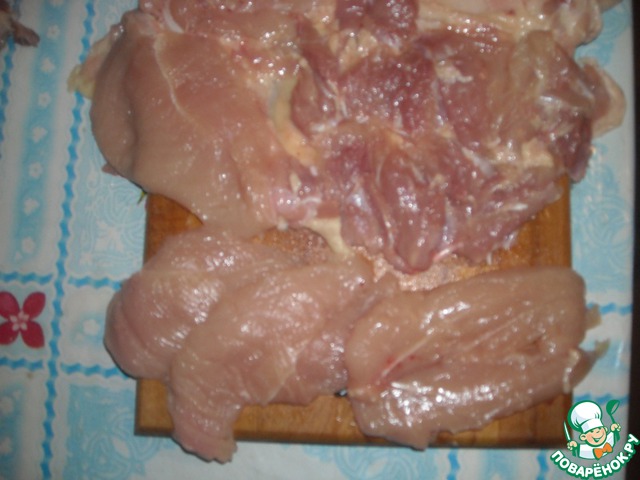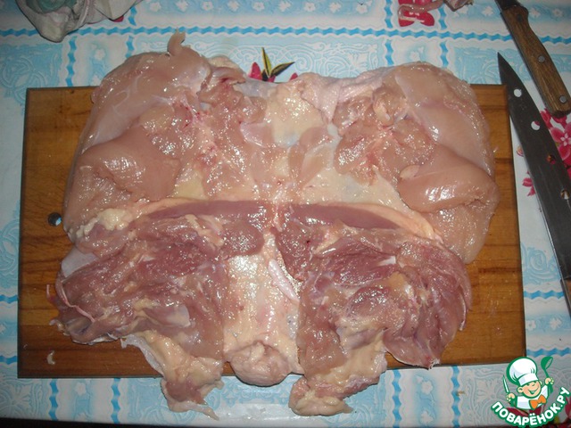 Теперь выравниваем нашу мякоть. Срезаем часть грудки и разрезаем (начиная от середины утолщений) филе на ножках как бы открывая книгу.