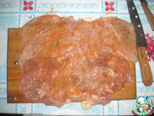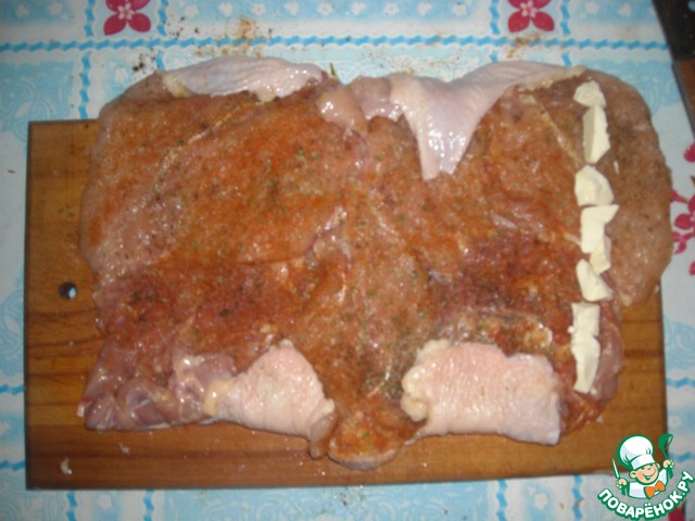 Раскладываем наши отбитые отрезки на наше филе с кожей в те места там где кожа или очень тонкий слой мяса выравнивая толщину. Солим, перчим, посыпаем специями.