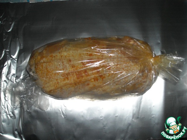 Пришло время готовки. Я не размораживая размотала из пленки, положила в рукав для запекания.