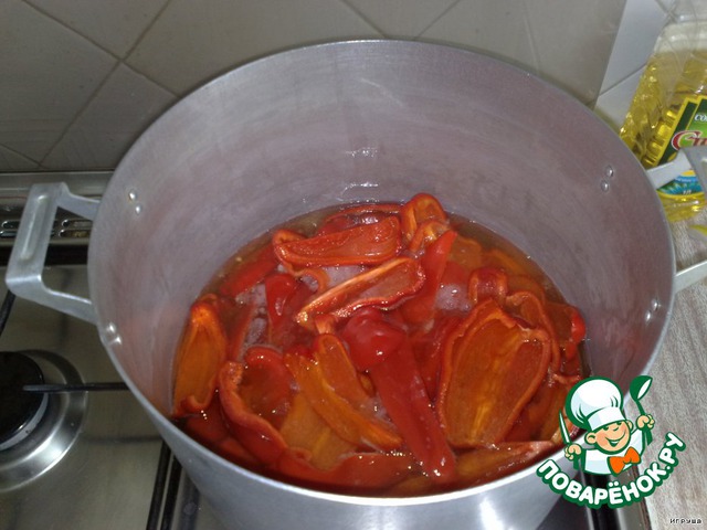 Все составляющие маринада смешиваем, кипятим. Порциями кладем перец, варим 12 мин.