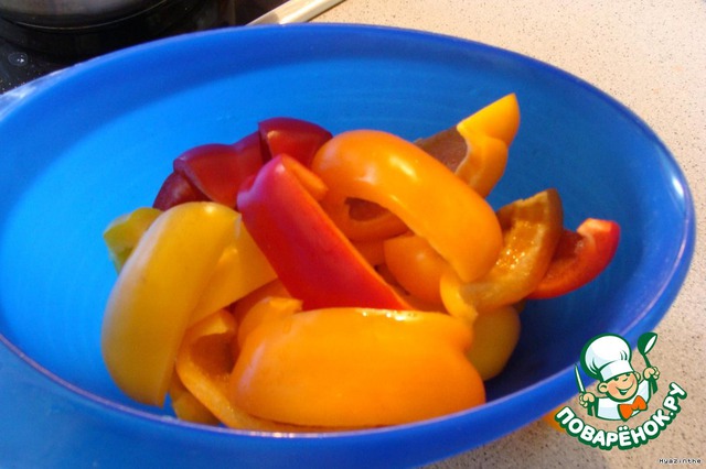 Разноцветный перец почистить, разрезать на 6-8 частей