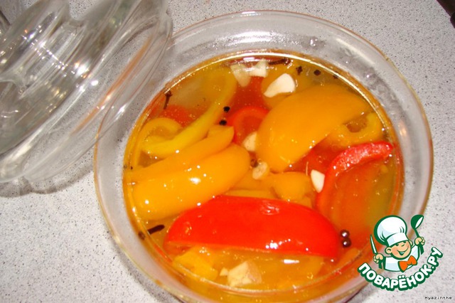 | Это обычный маринованный перец, но, если перчики разного цвета, получается ооооочень нарядное и веселое блюдо, которое украсит и праздничный стол. |