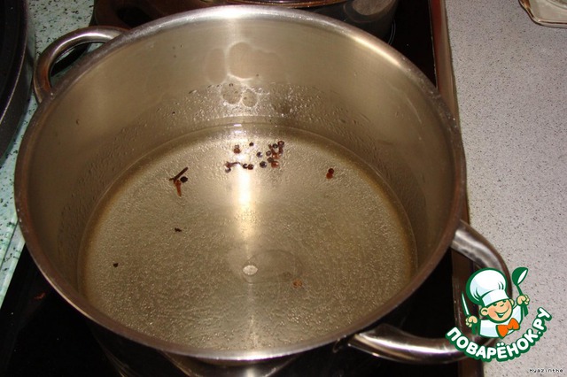 сварить маринад, добавив в воду сахар, растительное масло, уксус, соль, приправы