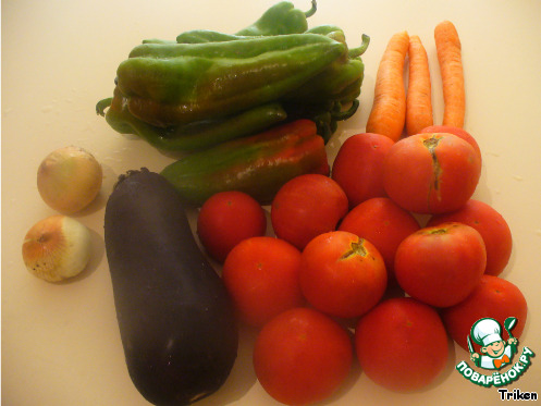 Снимите с баклажана кожуру и выньте семечки. Перцы (слейте накопившуюся из них воду) и баклажан порежьте мелко (или пюрируйте на блендере/пропустите через мясорубку - у меня ее не было и сделала так), смешайте, добавьте к помидорам и тушите еще 40 минут-час, периодически помешивая, чтобы не подгорело.