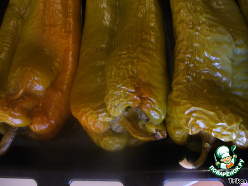 Помытые перцы разложите на противне и запеките 40 минут при 180 градусах. Они должны сморщиться, но не слишком сильно. Если боитесь, что подгорят снизу - ставьте температуру ниже. Так они должны выглядеть.