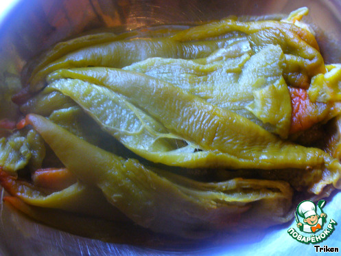 Остудите перцы и снимите кожу, также удалите плодоножку и семена. Отложите в сторону.