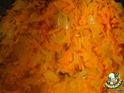 Лук обжарьте до прозрачности на перекаленном масле, добавьте морковь и еще обжарьте.