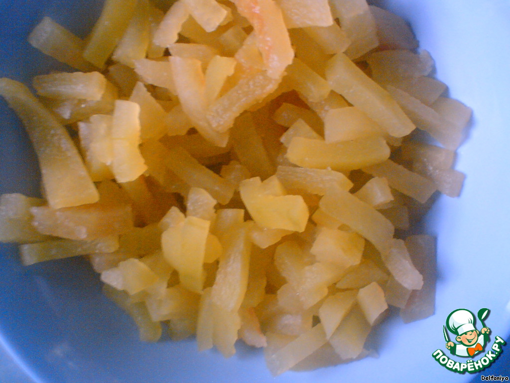 Очистить корки от зеленой шкурки и нарезать как на цукаты. Вскипятить воду в кастрюле и отварить корки до мягкости. Воду слить и отложить корки.