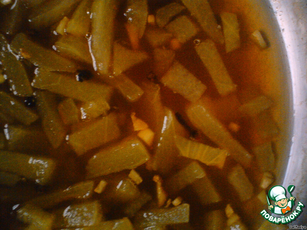 | Случайно нашла такой рецепт в сети. До этого делала только варенье и цукаты из арбузных корок. Корочки получаются почти как огурчики маринованные, но помягче. Можно использовать в салатах (винегретах), рассольниках. |