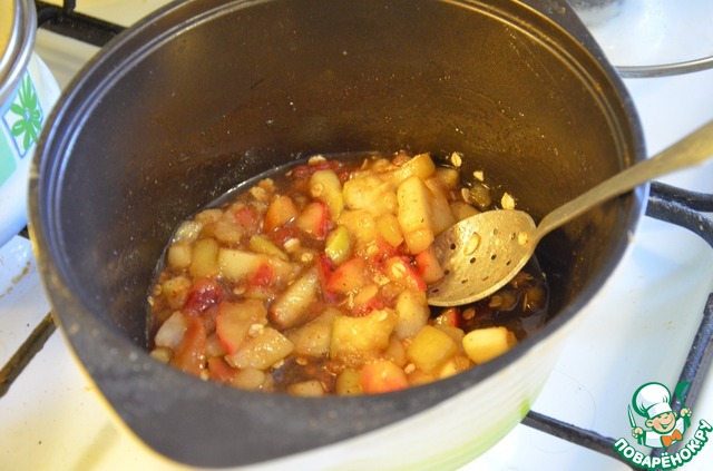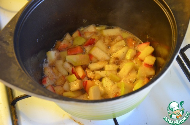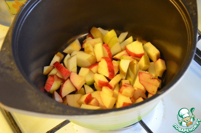 Режем яблоки, добавляем воду, ставим на огонь, тушим 1.5 минуты