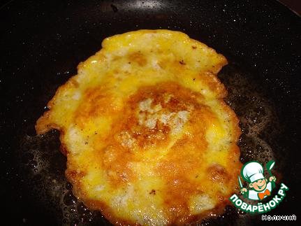 На сковородку выливаем яйцо и посерединке спускаем с тарелочки мясо прямо в центр яйца, накрываем крышкой и жарим