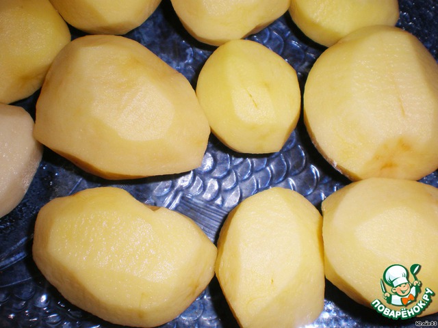 Картофель очистить, помыть и проколоть насквозь, но так, чтобы картофелина не развалилась и не распалась на половинки.