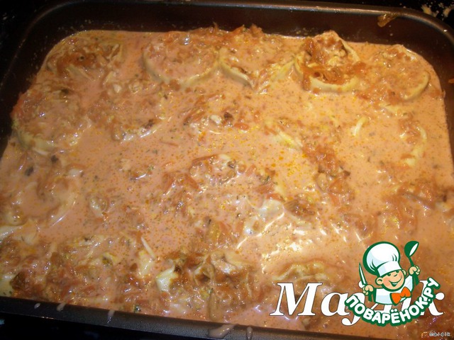 Эти розочки поставить в форму, прослаивая отложенным фаршем.