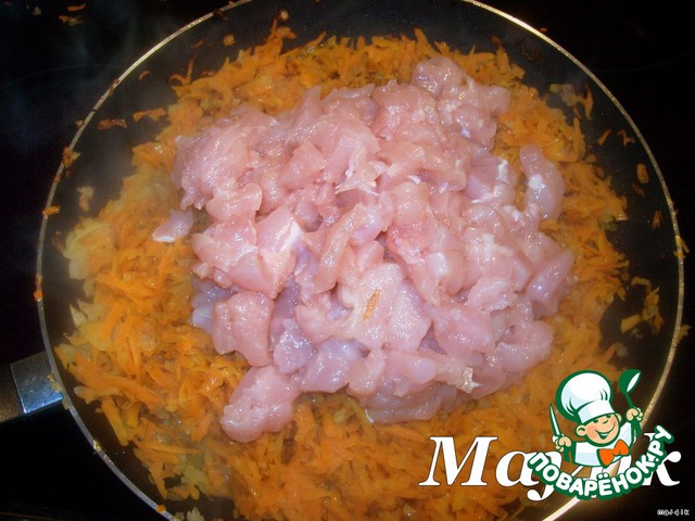 Добавить к овощам и обжаривать до готовности грудок.