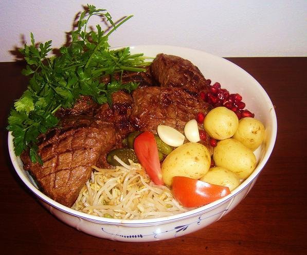 Гарнир может быть любым. В данном случае - это молодой картофель, обжаренные ростки фасоли, зёрна граната, маринованые огурчики, свежий помидор, чеснок и зелень! Кстати, на второй день мясо будет еще вкуснее (если останется, конечно...)