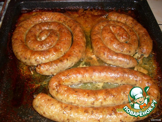 Подготовленные кишки(чистить кишки мне не понравилось... приятного мало,но оно того стоит)начиняем фаршем, при помощи специальной насадки.Завязываем концы и укладываем на противень.