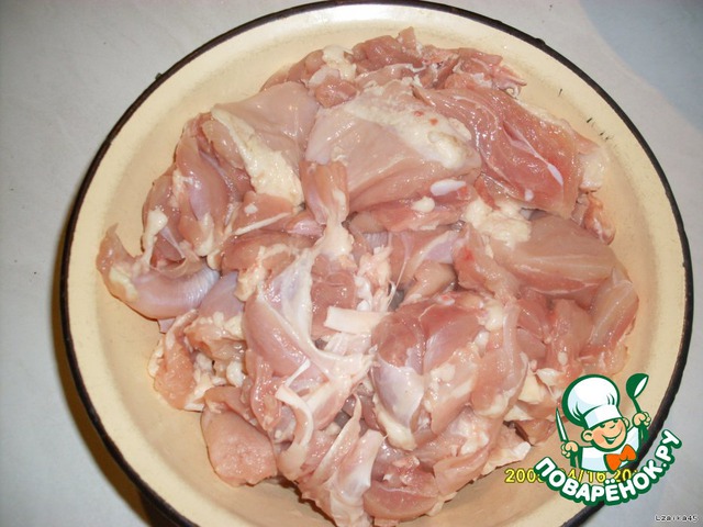 С окорочков обрезать мясо. Отдельно снять жир и шкурку.(У меня было 6 средних окорочков ).