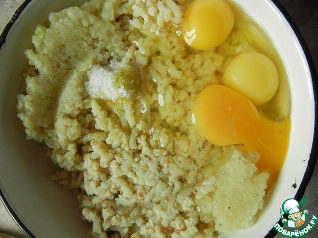 Затем измельчаем рыбу, лук и картофель (я воспользовалась мясорубкой, чтобы пюре было более однородным). В полученную массу добавляем яйца, оливковое масло, соль, перец и пряности. Все перемешиваем.