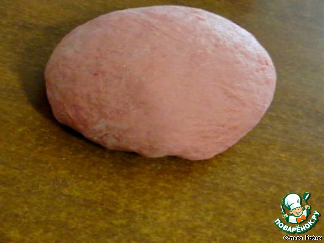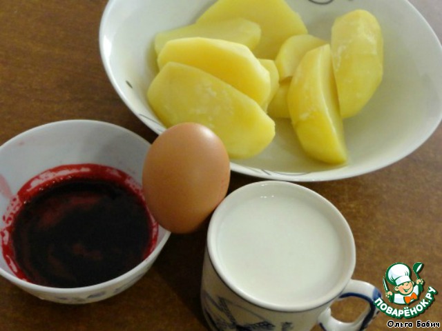 В теплый картофель добавить сок свеклы, молоко, яйцо.